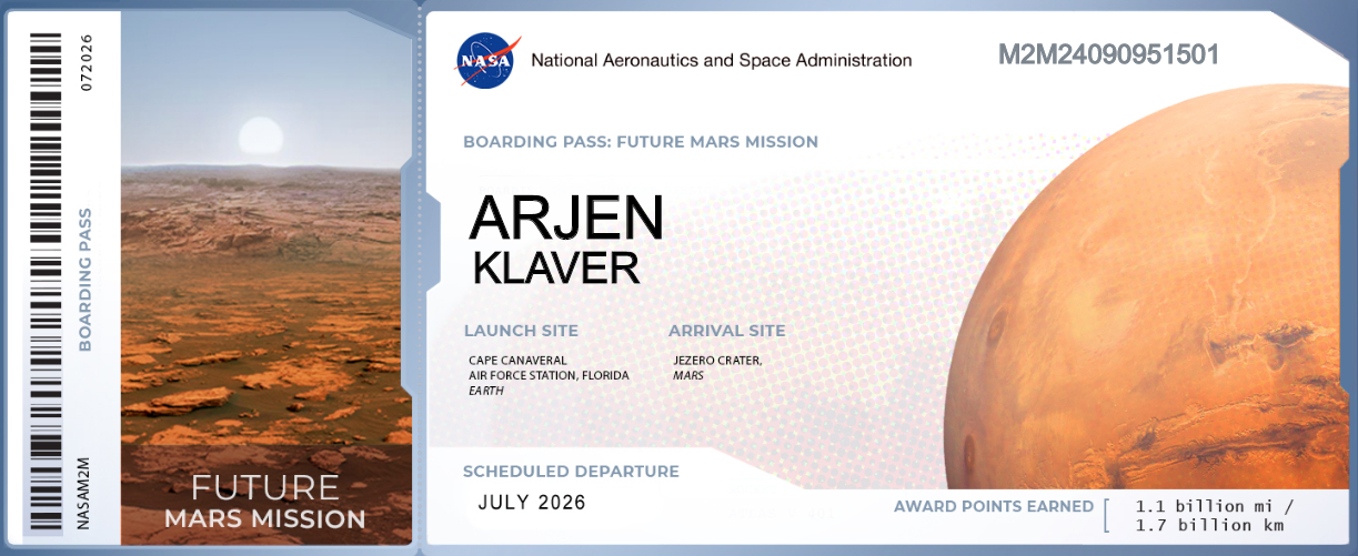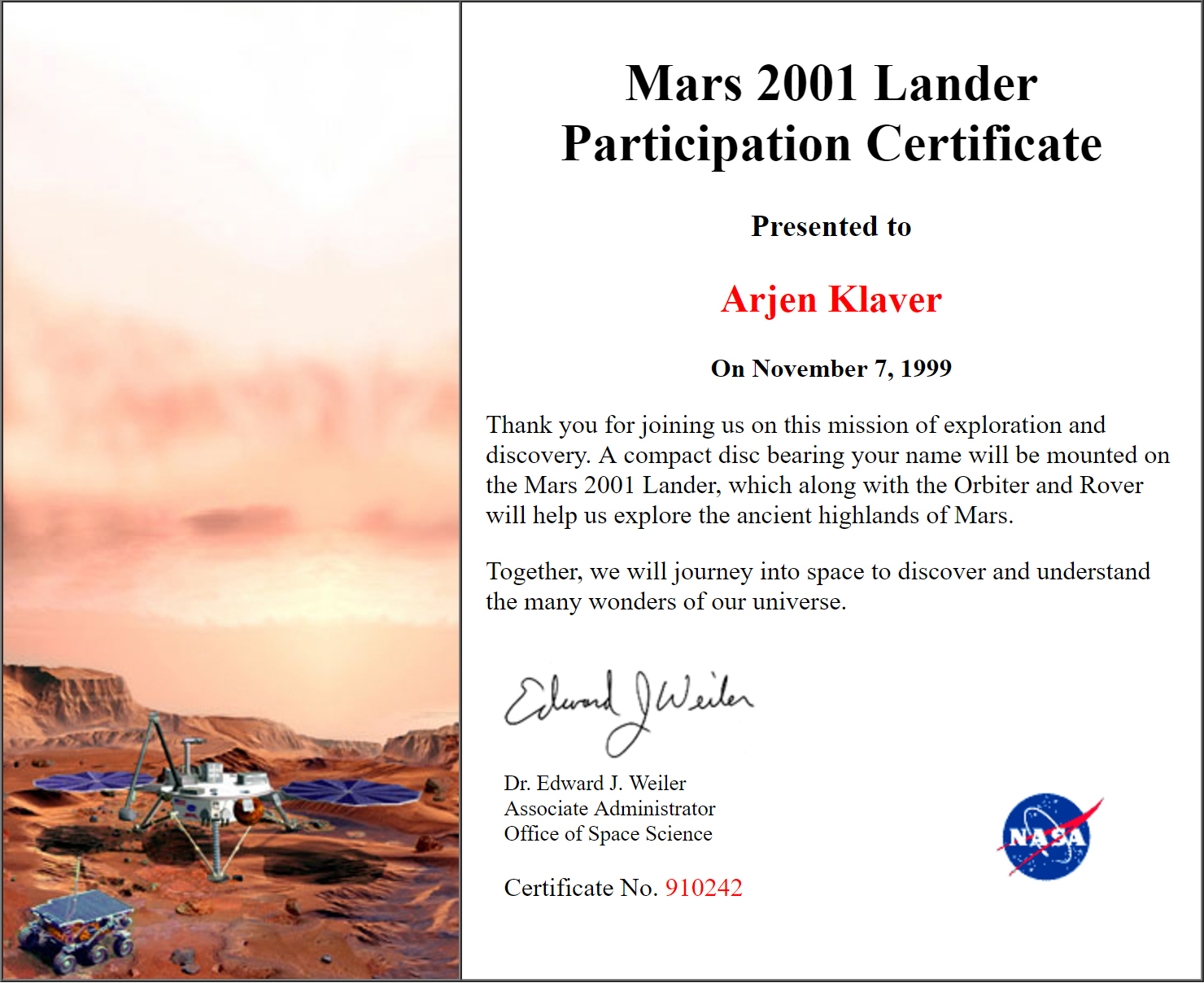Ik kon het dan ook niet laten (“gekken en dwazen….”) om mij in te schrijven toen NASA aankondigde dat iedereen die dat wilde zijn/haar naam kon laten zetten op een chip die meegestuurd werd met een Marslander missie.